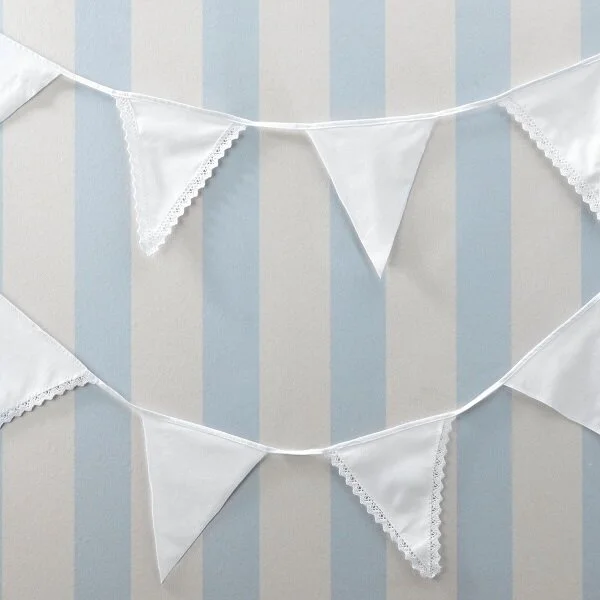 A string of gorgeous white cotton bunting with alternate lace edged and plain triangles. This beautiful white cotton bunting is a stunning way to decorate a wedding venue adding a romantic touch. £1.50 per metre.